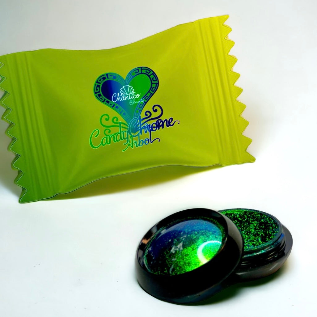 Our brand new Candychromes are multi-chrome eyeshadow pigments with added gel to make it easy to apply. These are highly pigmented. Unlike a textured or two-tones eyeshadow, multi-chrome eyeshadow shifts between three and four colors as you move it and depending on how the light hits it.
